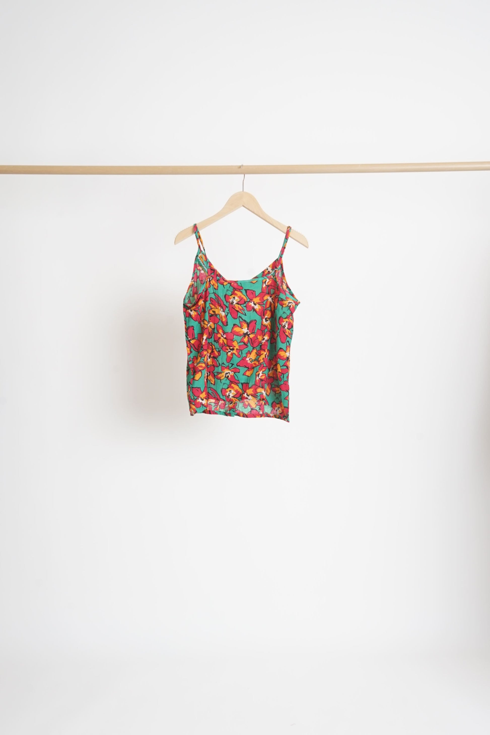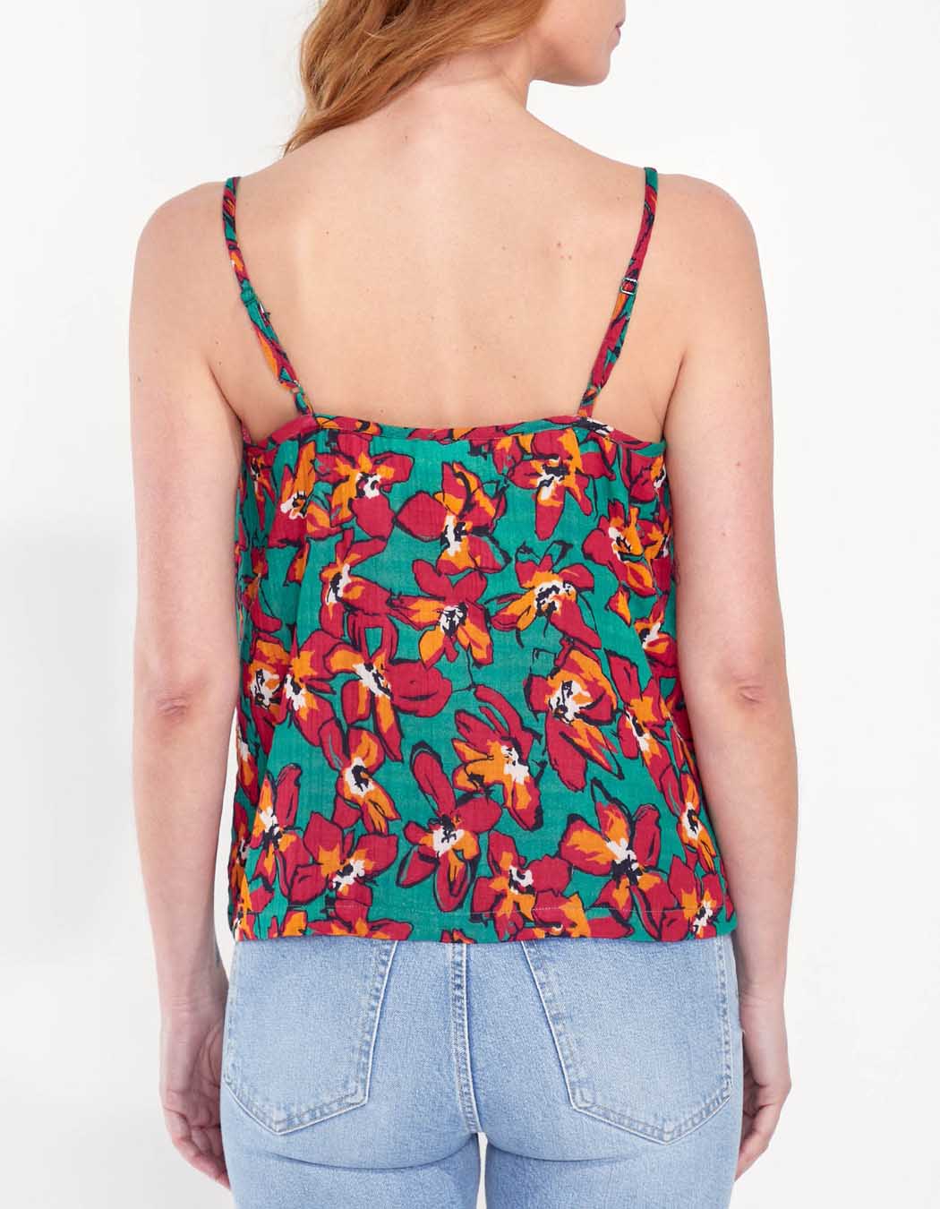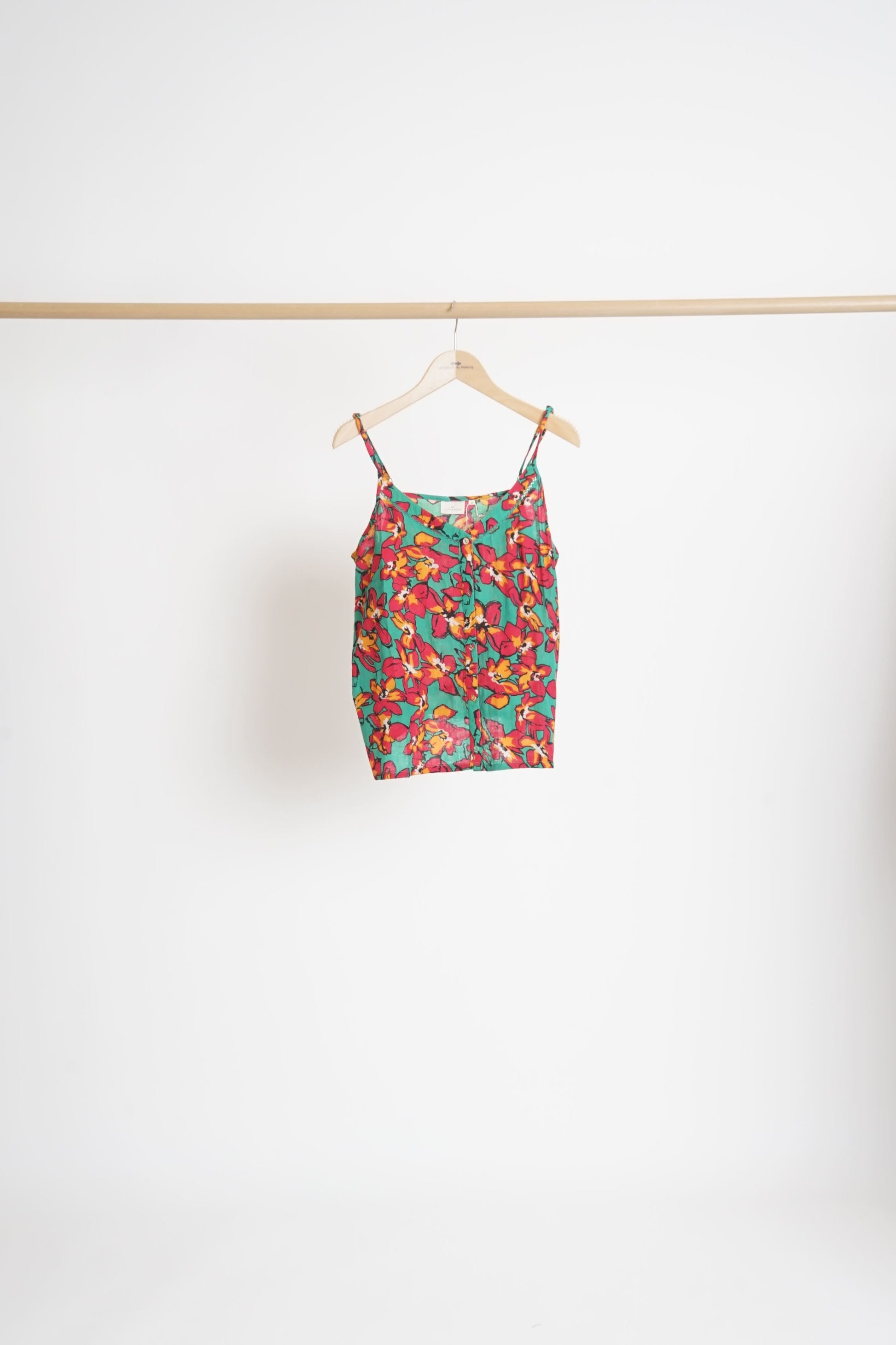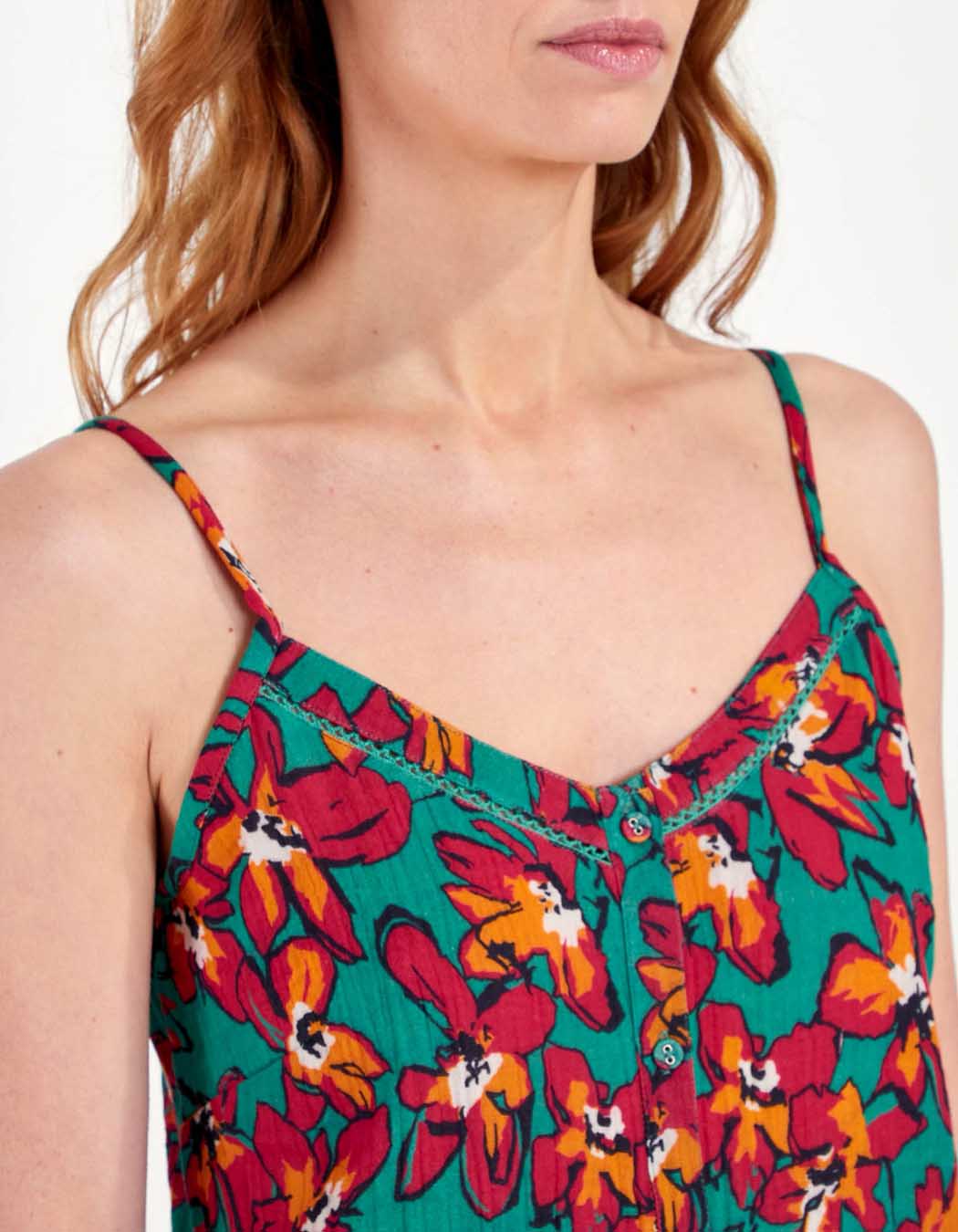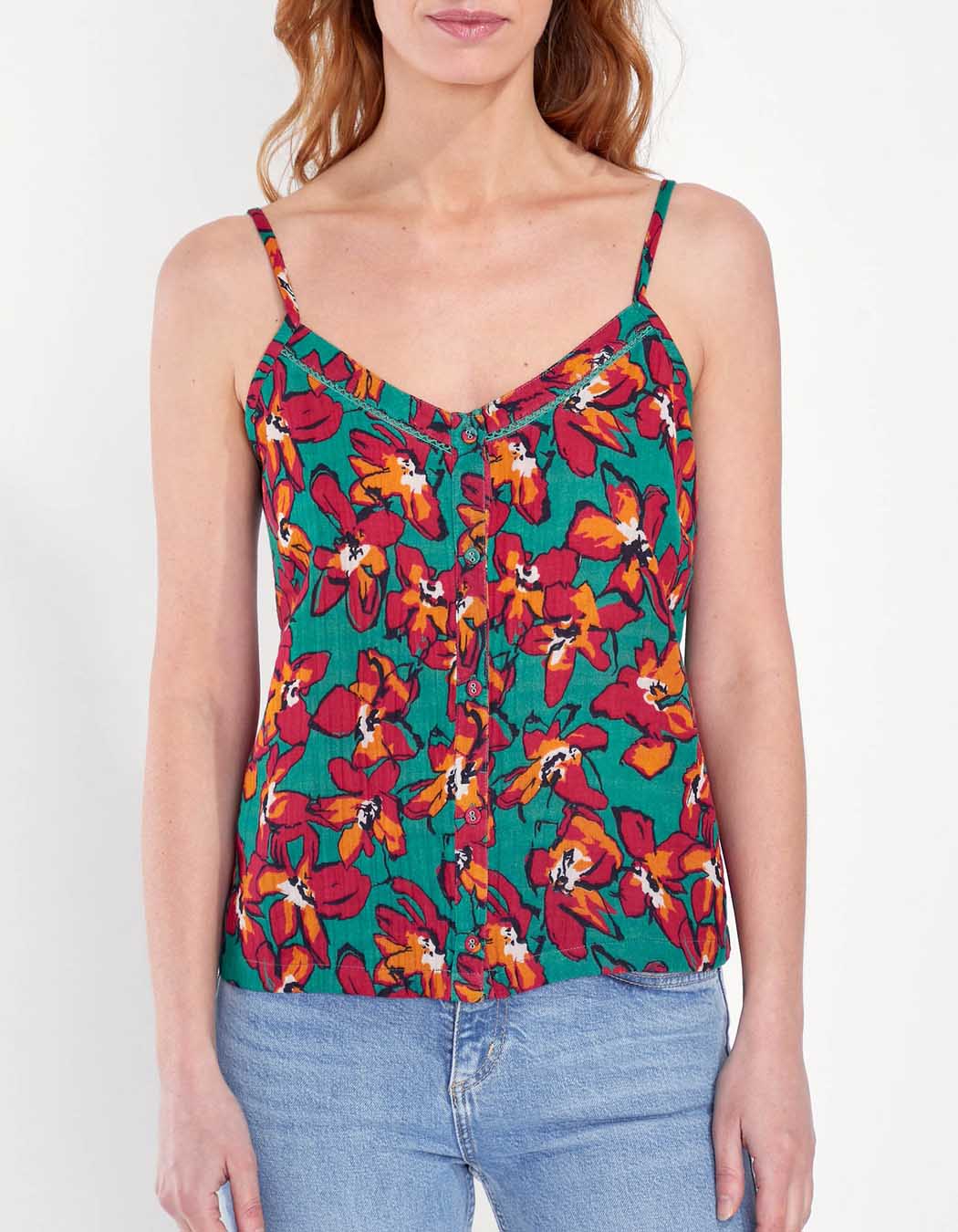 Débardeur imprimé avec bretelles réglables qui s'adapte parfaitement à toute les morphologies. Top en coton avec ses Boutons recouverts sur le devant lui apporte une touche très féminine.