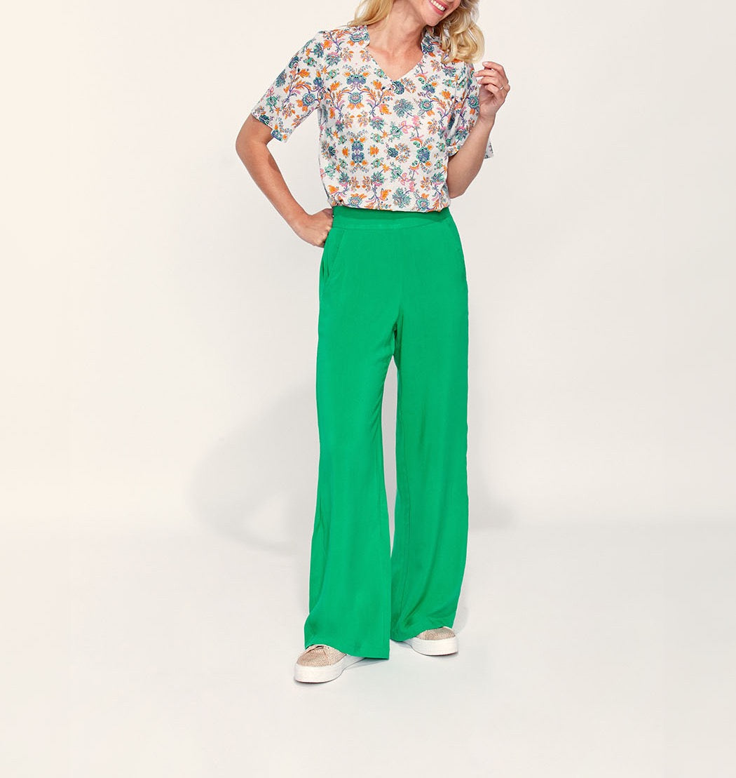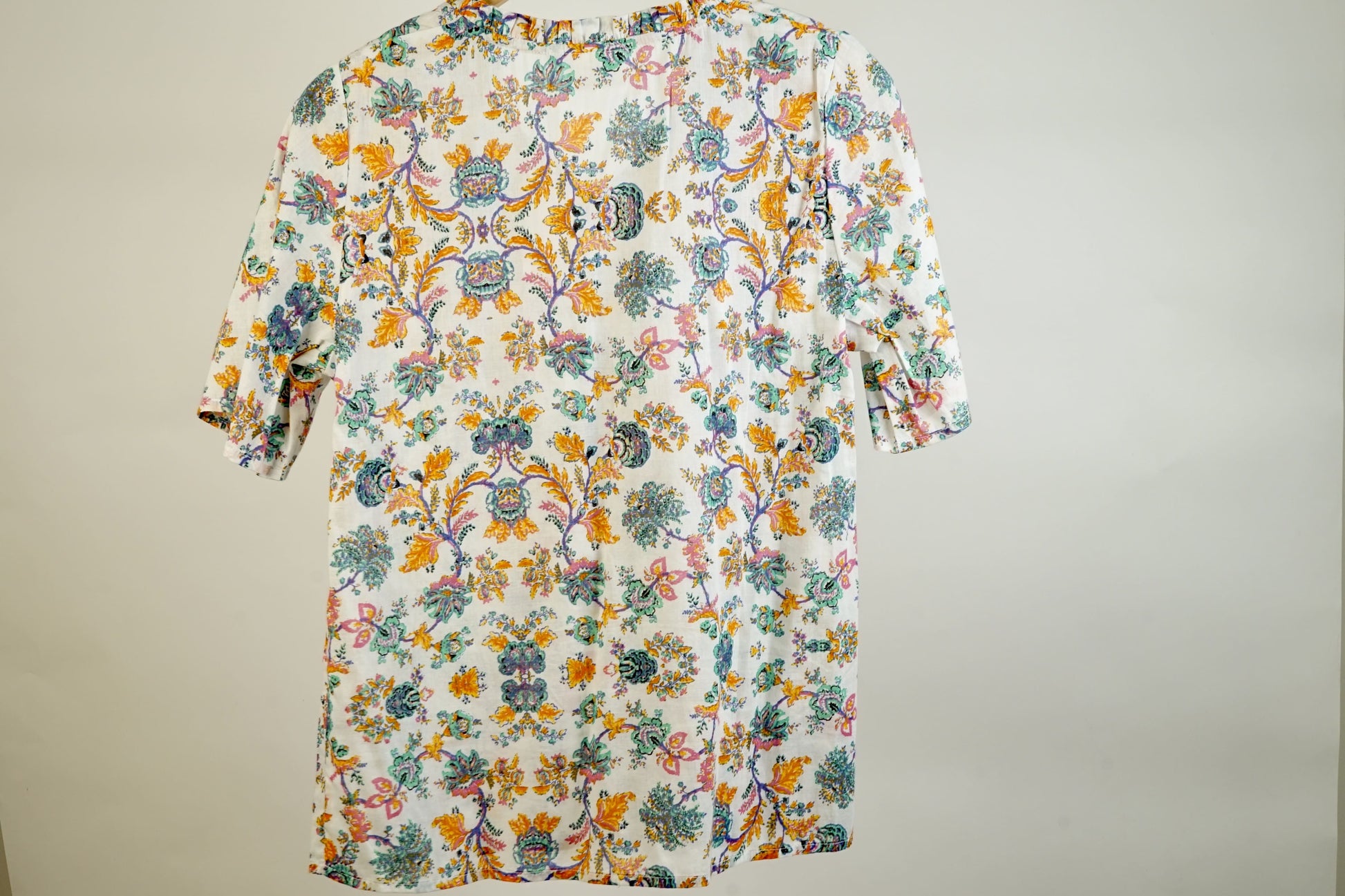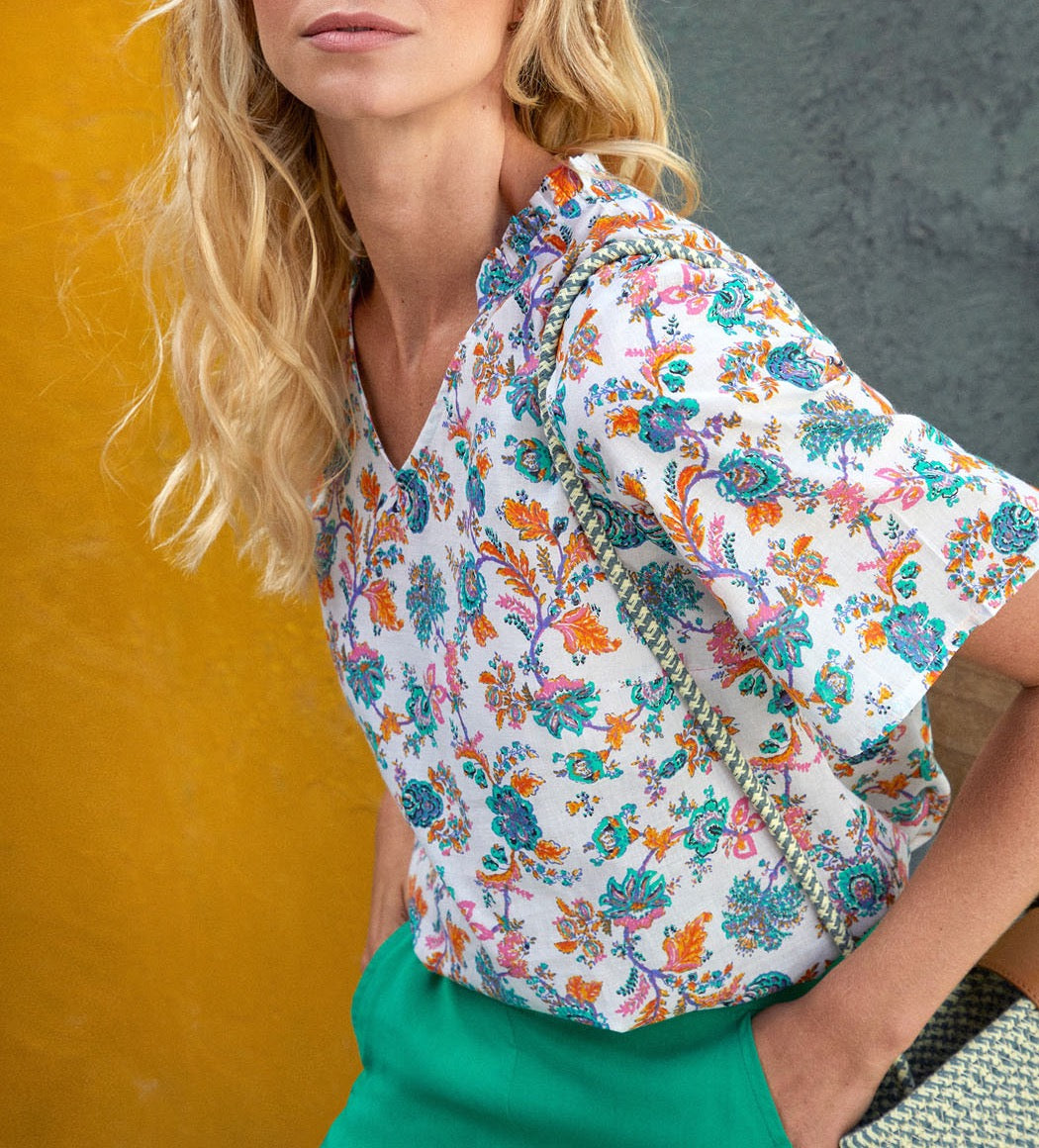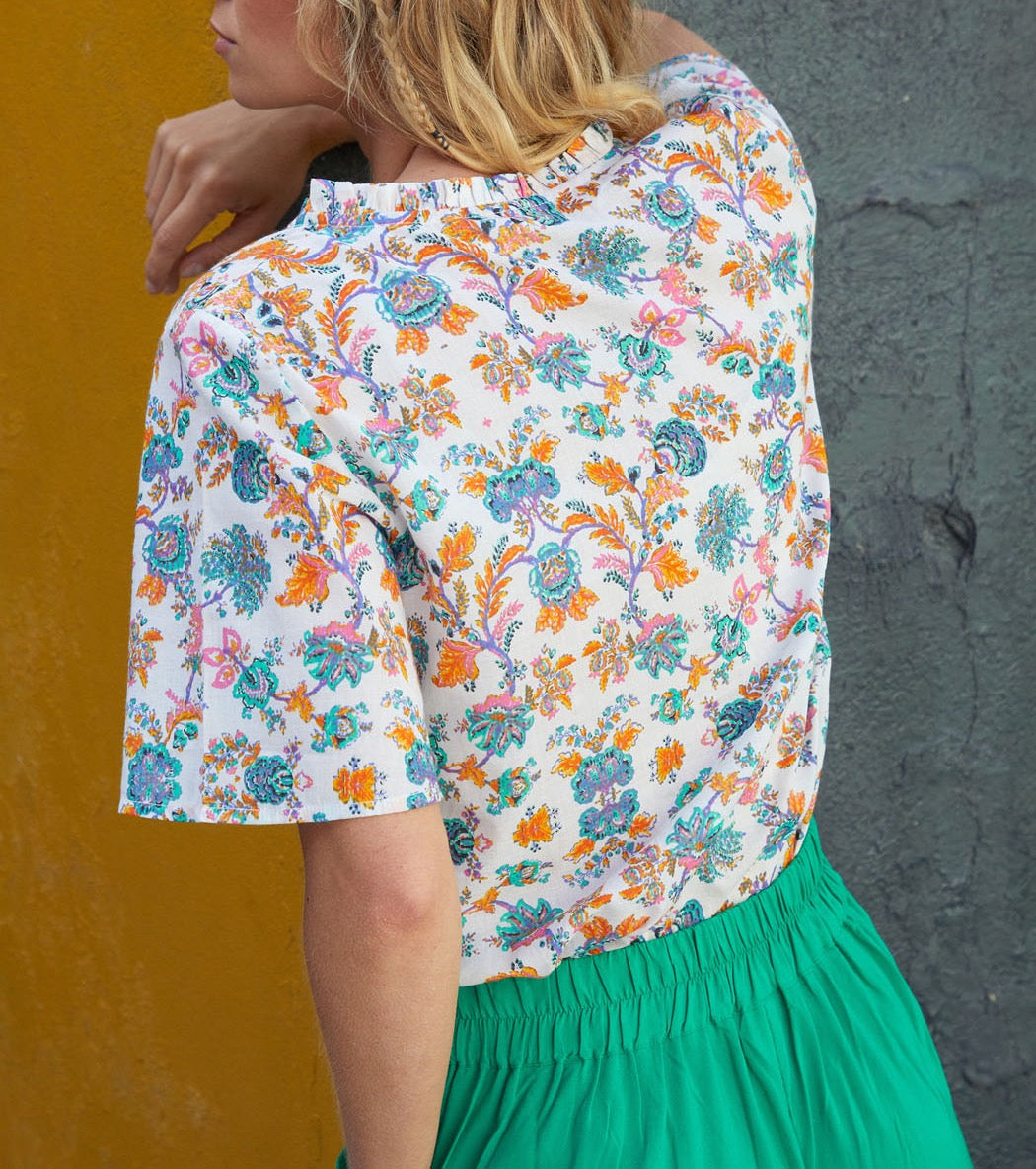 Top manches courtes imprimé original avec son col volanté pour un look tout en féminité. Ce top coupe droite en coton biologique se décline dans des imprimés inédits et dans de beaux unis intemporels texturés avec des petits pois relief