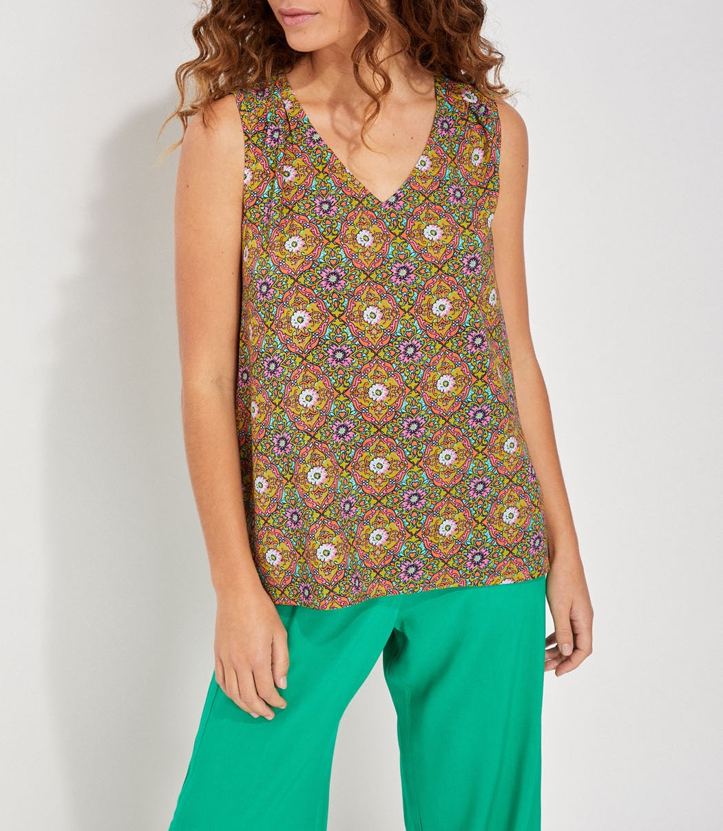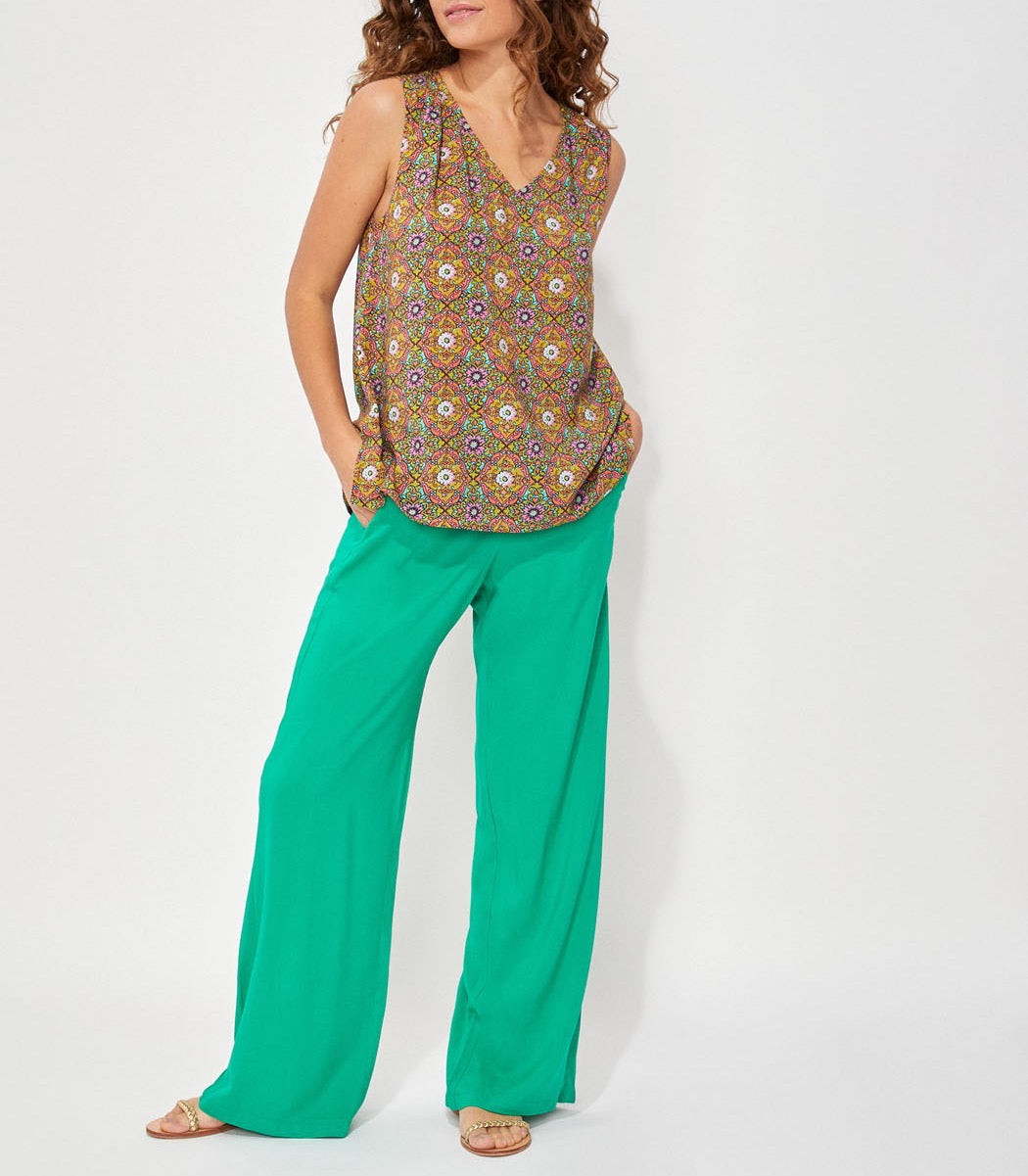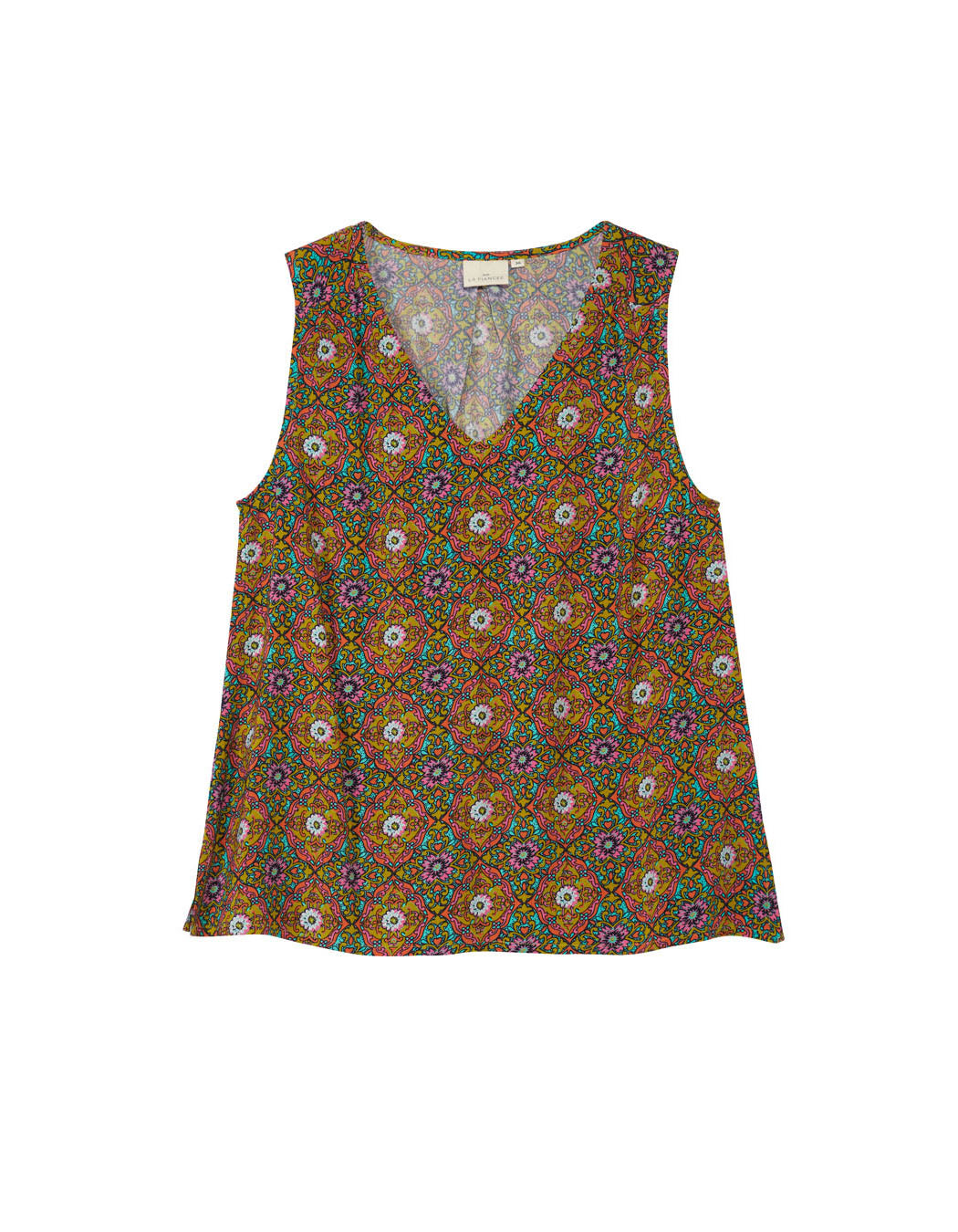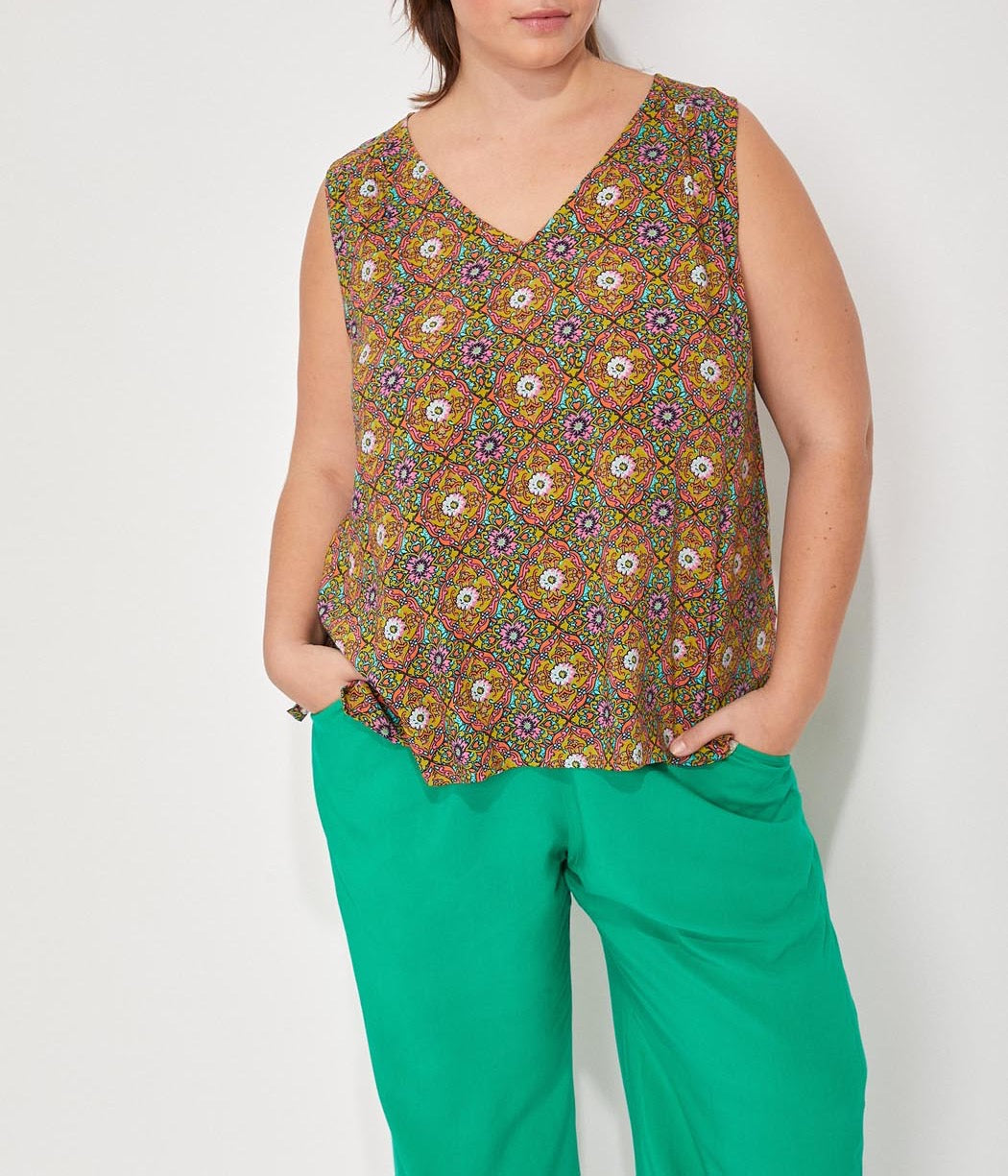 Top coloré idéal avec sa coupe evasée dans une matière fluide et douce en voile de viscose Ecovero, chic et simple à la fois, un basique féminin avec son joli col V qui met en valeur.