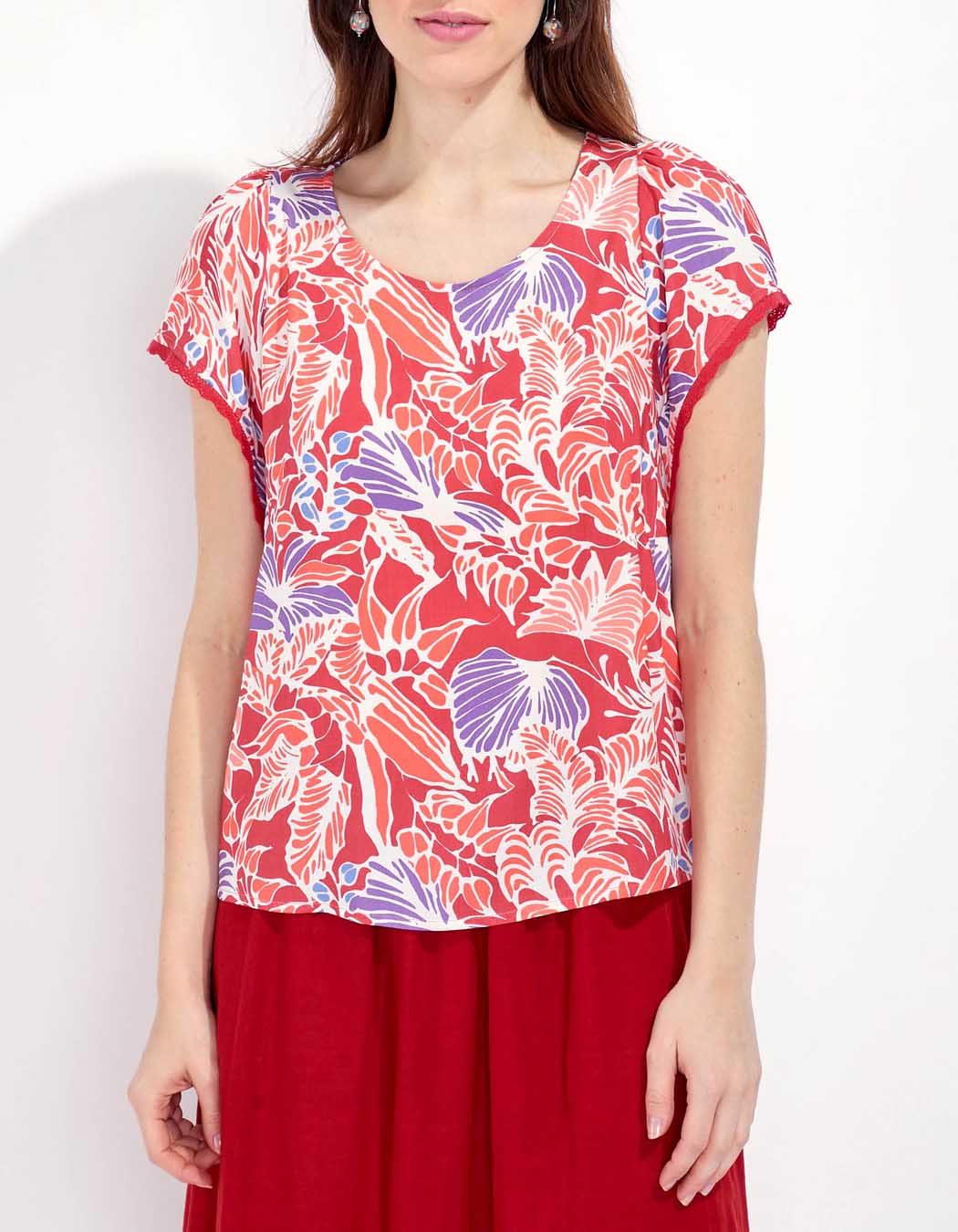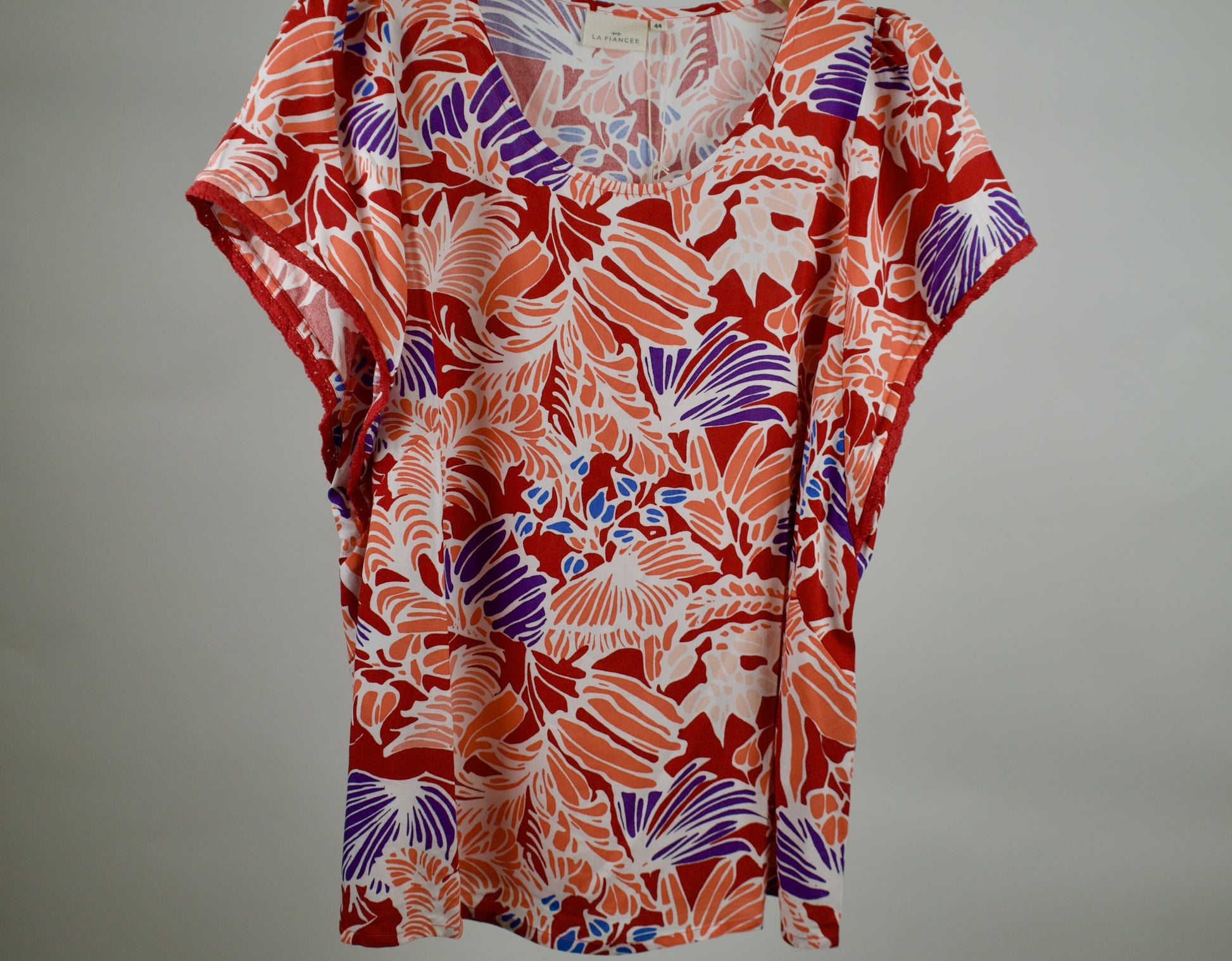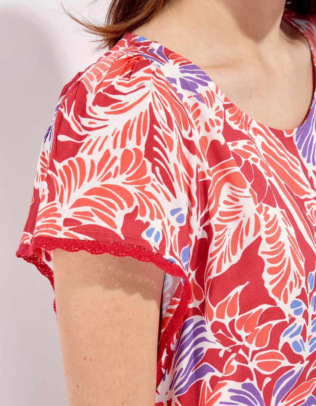 Top fluide original imprimé, très facile à porter et féminin avec sa belle finition dentelle sur les manches courtes.