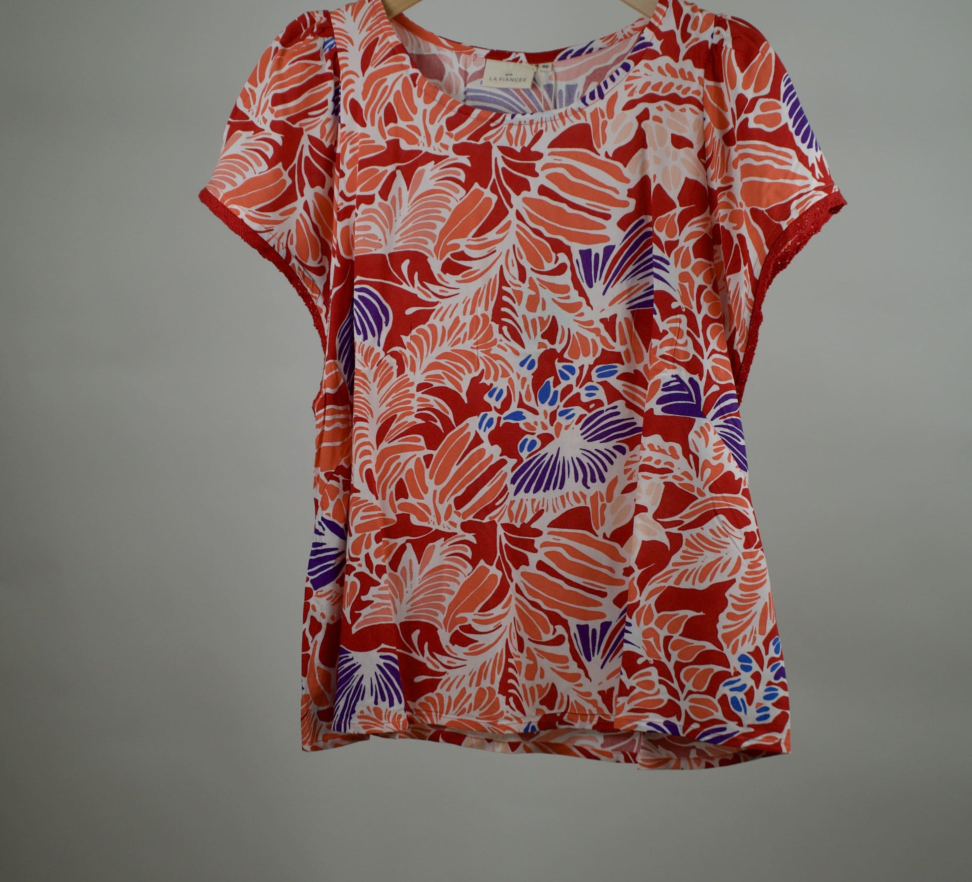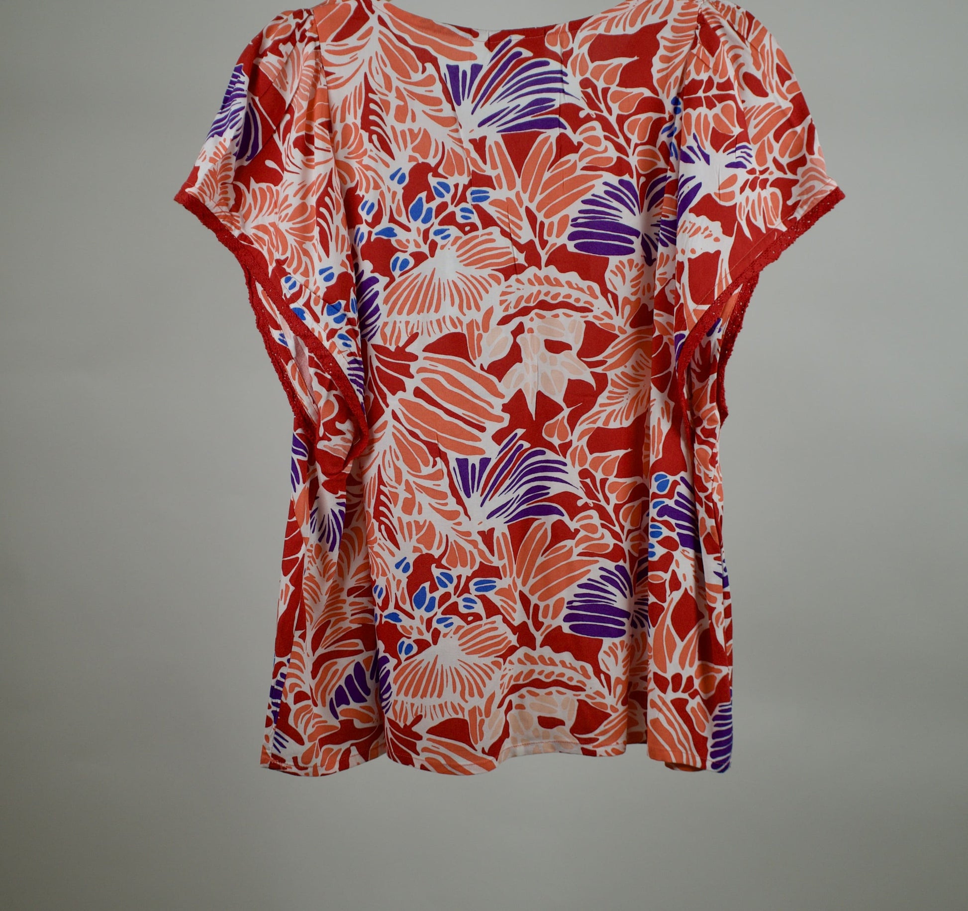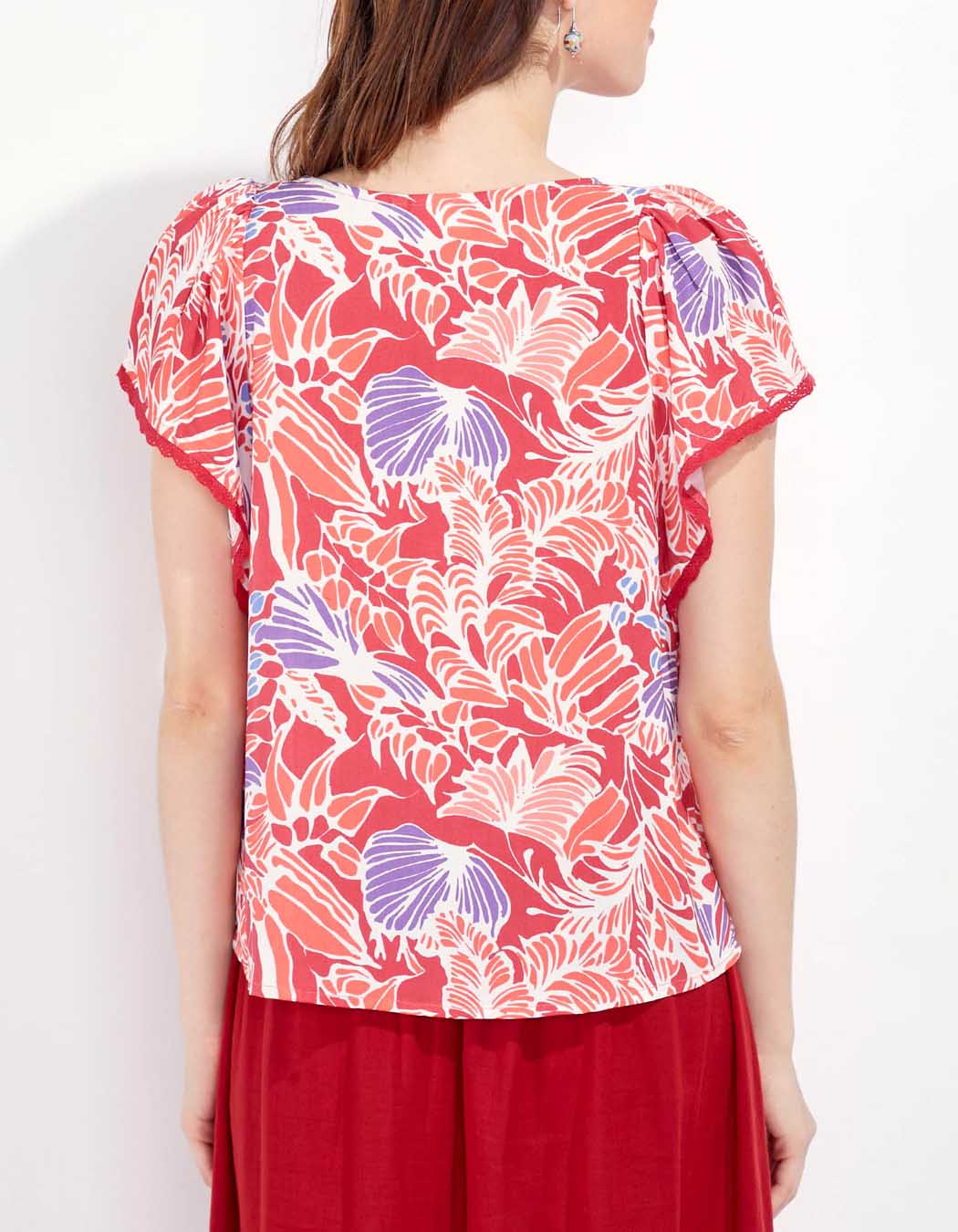 Top fluide original imprimé, très facile à porter et féminin avec sa belle finition dentelle sur les manches courtes.