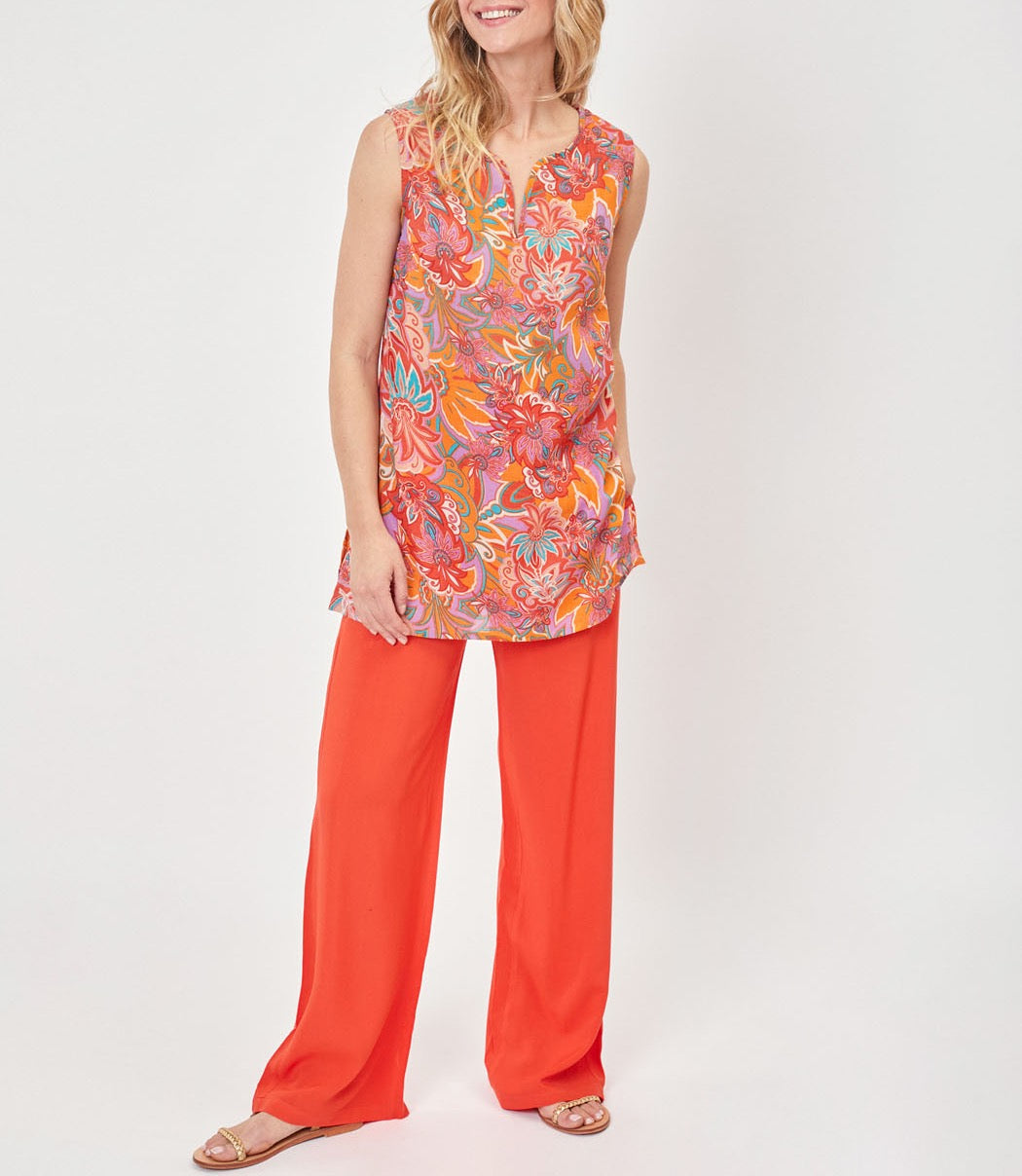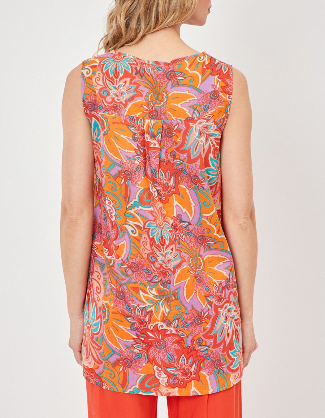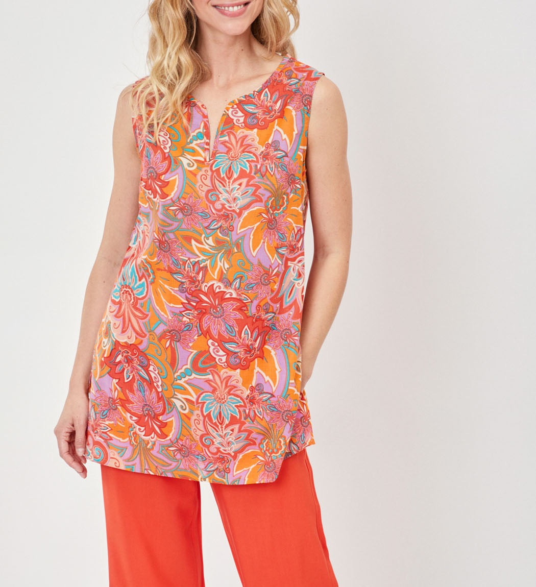 Tunique encolure tunisienne sans manches en coton biologique imprimé. Sa coupe droite et sa matière ultra confortable est idéale pour toutes les morphologies du 36 au 50. C'est la tunique facile à enfiler que l'on peut porter par dessus un pantalon ou un short uni.